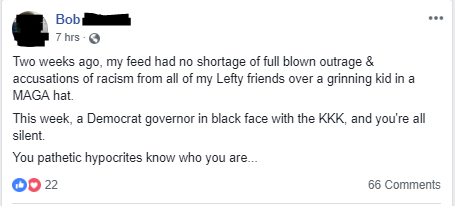 No one is more privileged and entitled than many middle class white women who vote Democrat. That’s what makes some of them so Facebook Fragile. Such was the case with this week’s installment. Someone decided to respond to remark I made on a post from my friend, “Big Bob Newhouse.” In it, he comments on the Facebook silence from our leftist friends regarding the recent blackface scandal involving Virginia Governor Ralph Northam. None of our mutual friends who are outspoken leftists said a single word about this. A smiling kid in a MAGA hat drew more outrage and virtue signalling in our newsfeeds than Northam did. Bob had this to say about it: