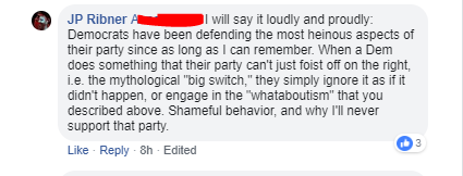 Bob got what I meant, as did other people who know me. For those who don’t, I’m happy to explain. Democrat voters are surprisingly forgiving of the mistakes that members of their party make, even the most egregious ones. They will do mental gymanstics that would make Simone Biles jealous in their fervent yet misguided attempts to defend their fellows Dems. Not only that, the mob mentality is in full effect when you argue with them on Facebook about politics. You can be debating the merits of Obamacare with one of your friends and suddenly fending off furious insults and threats from up to 10 of his/her Facebook friends. So yeah, politics is a team sport to those on the left.