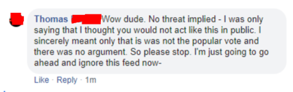 I just hope Tommy learned something from this exchange. I hoped I was able to help him realize that you can’t smear people with your shit then spare yourself a retaliation simply by saying, “I’m not here to fight.” Actions speak louder than words, and the people who Tommy attacks won’t be stupid enough to believe he’s trying to avoid a fight… especially if they’re standing there covered in his metaphorical Facebook feces. Should I ever encounter him again and he hasn’t learned this lesson, I’ll be sure to bitch slap him like I was his daddy and he took the last piece of chicken at dinnertime. Big league.