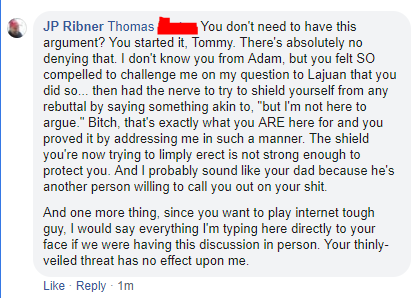 Big Grig and I were in a back and forth on a mutual Facebook friend’s page… then Tommy shows up and decides to insidiously interject himself into the interaction: